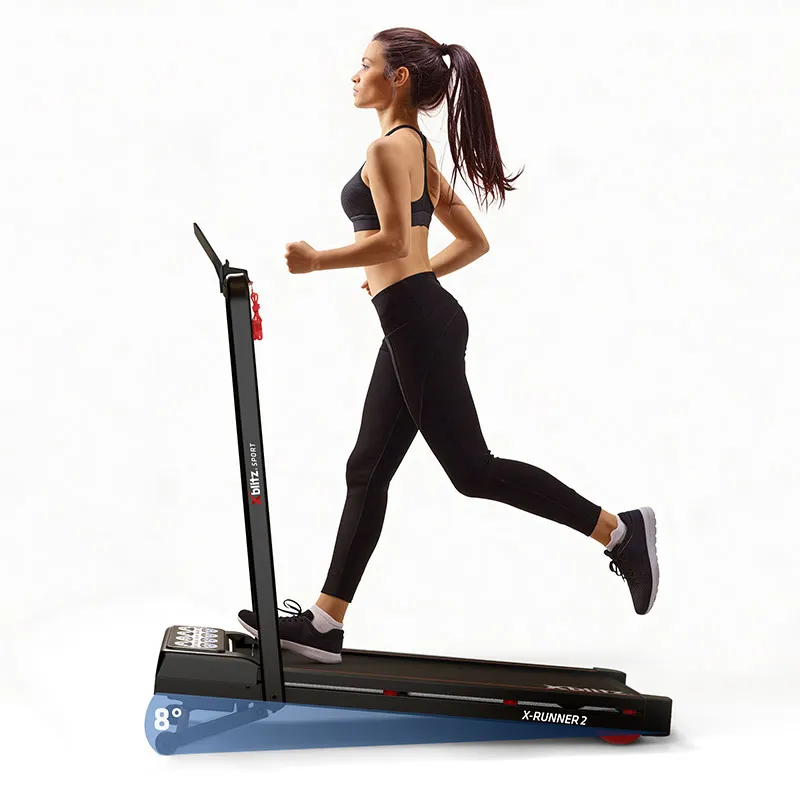 Bieżnia X-Runner 2 oferuje aż 8 poziomów nachylenia, regulowanych elektrycznie co 1 stopień, dzięki czemu najwyższy poziom zapewnia aż 8° nachylenia. Tak precyzyjna skala pozwala dopasować intensywność treningu do własnych możliwości i celów. Regulacja odbywa się wygodnie za pomocą pilota lub panelu sterowania, co umożliwia zmianę kąta bez przerywania ćwiczeń. To doskonałe rozwiązanie dla osób, które chcą zwiększyć różnorodność treningów, podnieść ich intensywność oraz lepiej odwzorować warunki biegu na świeżym powietrzu.